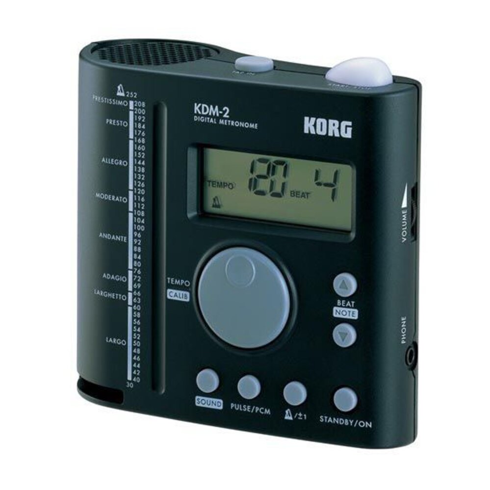 Korg's acclaimed cylindrical speaker has been further enhanced with an improved resonator structure to ensure that it's easily heard. Even loud instruments won't overpower its unmistakable, clear sound. And with the KDM-2 you have a choice of 3 different PCM sounds (cowbell/agogo/clave) for the beat, so you can choose the sound that compliments the instrument you're playing. The volume can also be adjusted to the most appropriate level. Since there's a PHONE jack, you can connect a mini-plug (1/8") earphone for private practice. - See more at: http://www.korg.com/us/products/tuners/kdm_2/#sthash.cGxvoXNr.dpuf